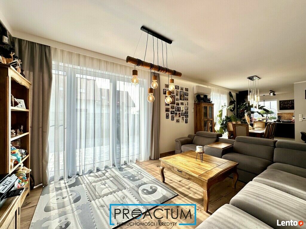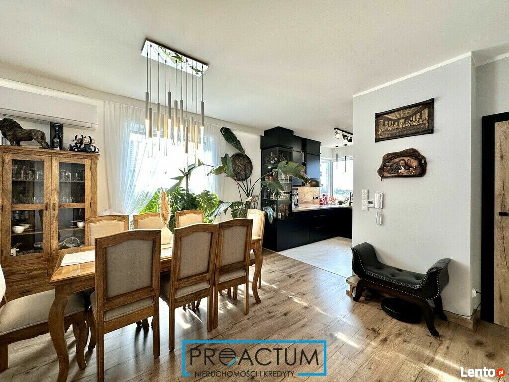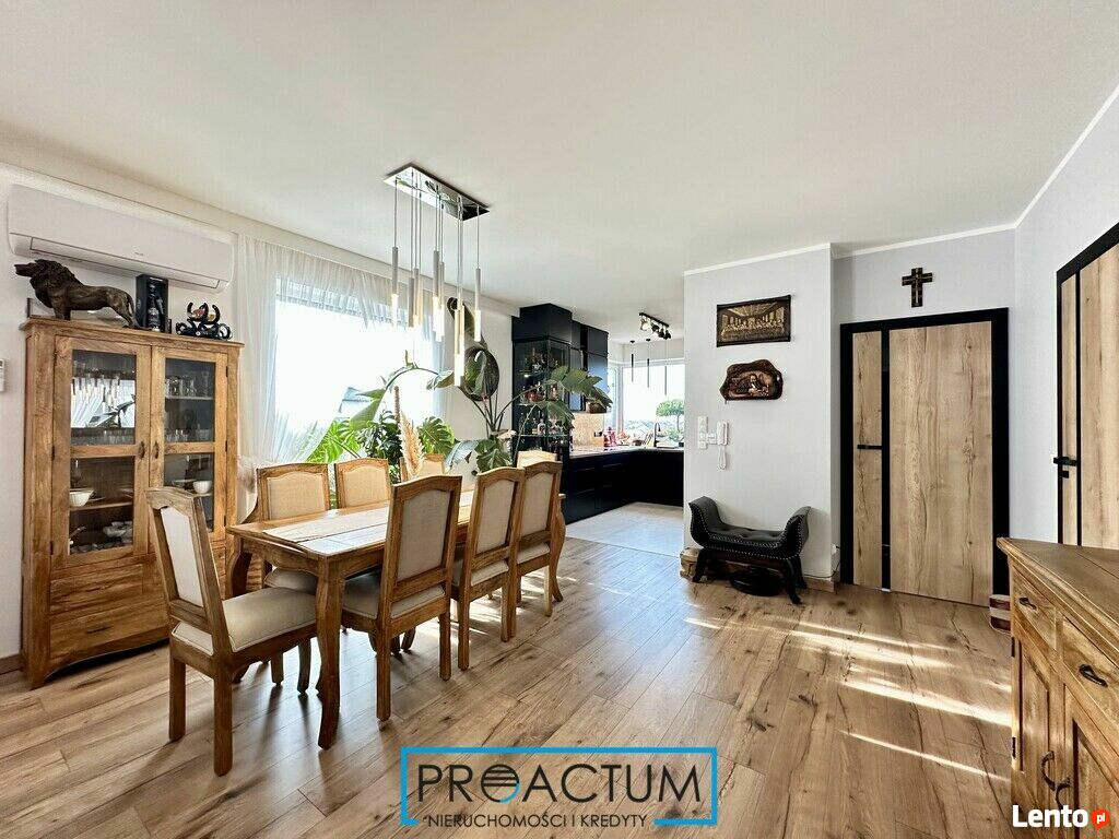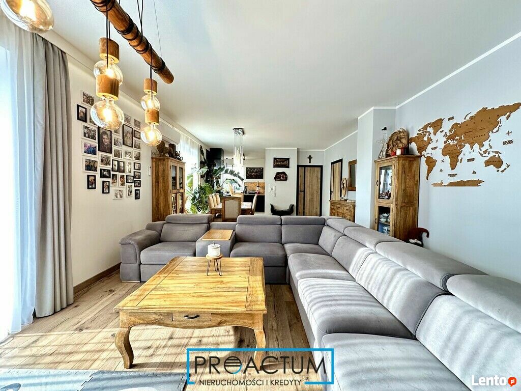 - Dużego salonu podzielonego na strefę relaksu i jadalnię